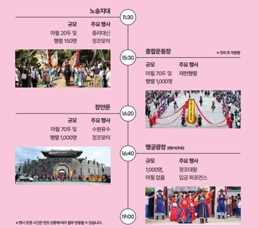 A. 정조대왕 행차 시간은 현장 상황에 따라 달리질 수 있는 관계로, 각 거점별 출발 시간을 확인해주세요.